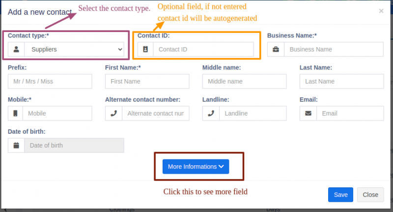 - Click on add new contact. Select contact type – Supplier/Customer/Both